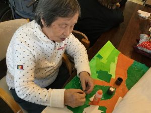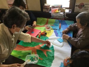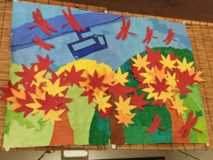 紅葉狩りの素敵な貼り絵が完成ですね。フロアに飾るのは皆様合作の塗り絵もです。