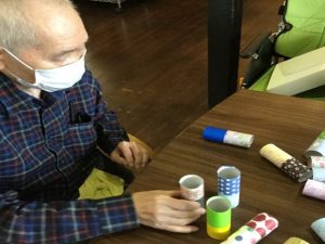 午後、スーパーガンバタイムと題した運動レクタイムでは週代わりで様々なゲームを行い、皆様に楽しんでいただいております。『立った立った〇〇が立った』では円筒を制限時間内にいくつ立てる事が出来るか?というゲームです。