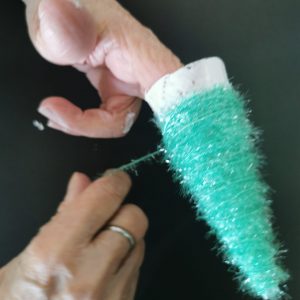 クリスマスツリーの土台に毛糸を貼り付けていきます。