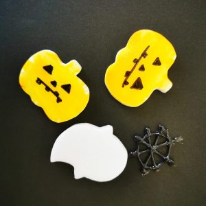 「今日は何作るの?楽しみにしてきました」とお話しされながら作品作りのスタートです。ますはパーツを貼り付けていきます。「カボチャとオバケが可愛らしい」と表情良くお話しされながら作っていきます。