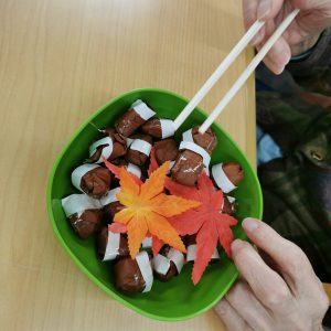 デイの中でも秋らしい物が沢山ありましたので今回はご紹介します。「秋といえば…」というお題で連想ゲームを行った際は紅葉、どんぐり、柿、お祭り、、、と沢山秋を感じるものが出てきました。