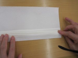 ペーパーを山折りにします。この山折りが難しいところです(@_@) 上手く指先を使われてきれいな山が出来ていますね。完成品が楽しみです。