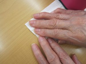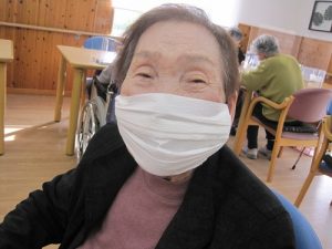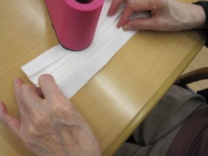 ケアプラス宇和島ではマスク着用をされていない利用者様と一緒にマスク作りしています。キッチンペイパーで作っている光景です。
