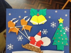 毎月の持ち帰りカレンダーの折り紙を創作レクリエーションで作っております。今月はクリスマスバージョンで作っております。
