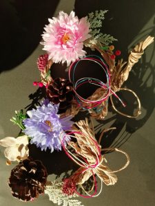 造花などで作ったパーツを飾り付けて完成です。