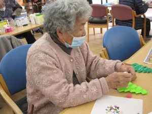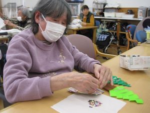 折り紙でクリスマスツリーを作り、そのツリーに皆さんでキラキラの飾りを付けて頂きました。