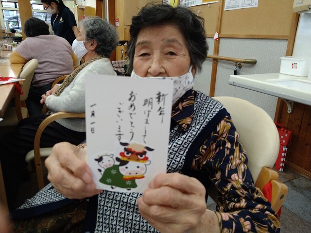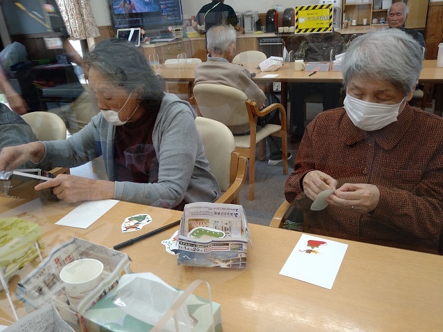 デコレーションも、「どこに貼ろうかなぁ…」と位置を変えながら、悩みながら仕上げられていました。完成した葉書はどうするのかとご利用者様に訊いてみると・・・「帰ったら嫁さんに渡すんよ」「今年は、孫に会えないからこの葉書を出そうかな」「孫に渡すんよ、喜んでくれるかな」と言ったことが返ってきました。今年はいつもと違う年末年始になりますから、きっと喜んでくださったのではないでしょうか(^_^)
