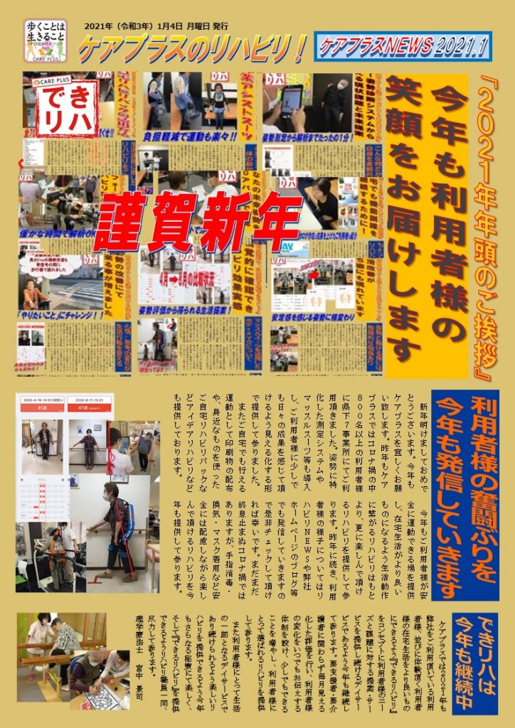 新年明けましておめでとうございます。今年もケアプラスを宜しくお願い致します。昨年もケアプラスではコロナ禍の中800名以上の利用者様に県下7事業所にてご利用頂きました。姿勢に特化した測定システムやマッスルスーツ等も導入し、ご利用者様に少しでも日々の成果を感じて頂けるよう見える化する形で提供して参りました。