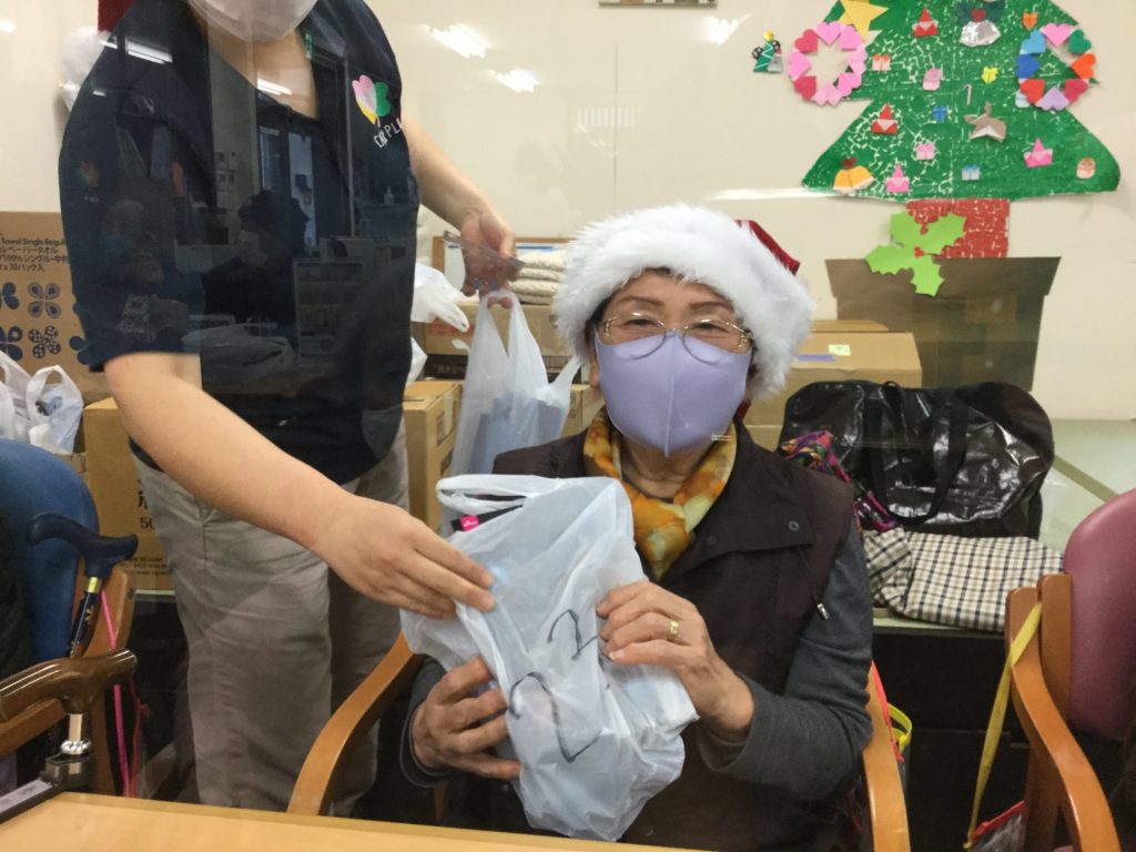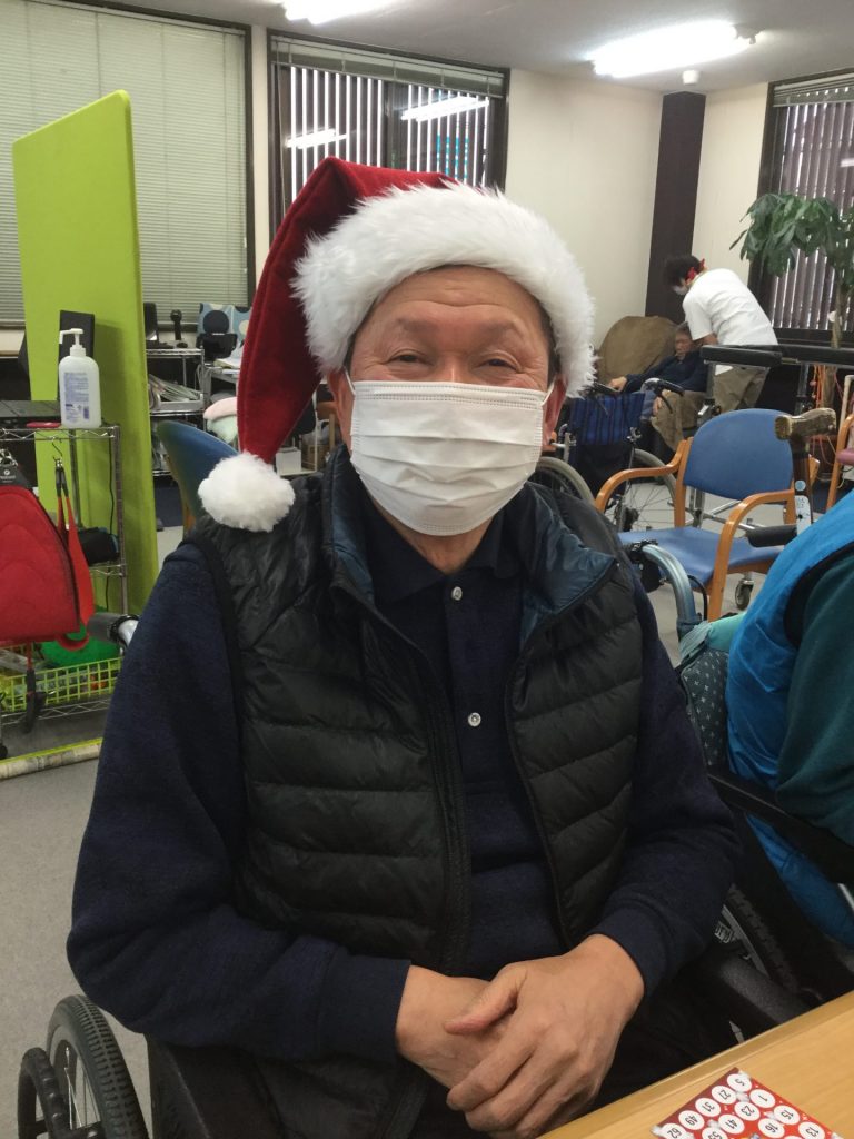 12月といえば「クリスマス」がメインだと思います。そこでケアプラスでは、クリスマスプレゼントを用意して、ビンゴ大会を行いました。「どんなプレゼントがあるんかな?」「いつも最後の方だから、今回は早く終わりたいなぁ」と言われる方がおられました。職員はサンタクロースの帽子を被ったり、トナカイさんのカチューシャを付けたり、盛り上げていきました。