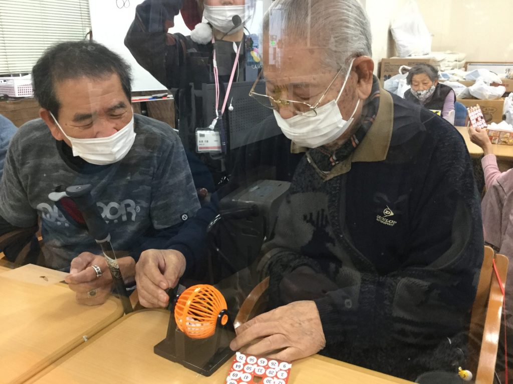 ビンゴ大会を始めると、まず初めにガラポンを回す人を選ぶのですが、いつも回したい人が沢山おられて、回す事を楽しんで頂いています。数字を発表する際、「早く言って~」「私その数字ないよ~」「お!ここにあった!」など様々な声が聞こえて私自身も楽しむことができました。
