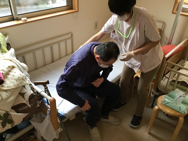 ベッドからの立ち上がりも、手を使わず脚の力で立つように意識されています。
