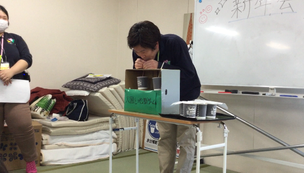 最後に行ったのは、天国と地獄ゲームです。各チームの代表に箱の中に隠してあるジュースを選んで飲んでもらいました。しかし、おいしいジュースをただ飲むだけでは面白くないと、いたずら好きの介護職員によって、1つはおいしいジュース。もう1つをタバスコ1本分、もしくはレモン汁を用意し2つの中から選びました。普通のジュースを選び、おいしく飲み切った職員もいましたが、タバスコを選んだ職員もおり、険しい顔をしながらも飲み干し、ご利用者様から拍手をして頂きました。
