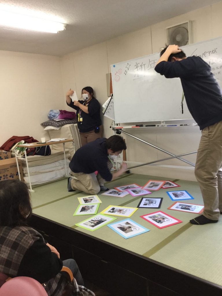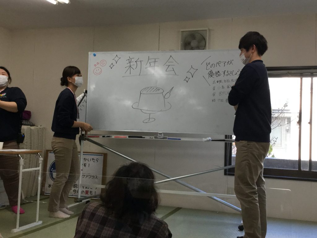 続いて、職員カルタは名前の通り、職員の写真にひらがなを書いた札を用意しました。職員も気合が入っており、どのチームも勢いよく札を取り合いました。いつになく真剣に戦う職員の姿にご利用者様も大笑いしながら、一生懸命応援して下さりました。カルタなので読み切る前に、札を取ってしまうので、取った後に写真を紹介しながらもう一度読み上げました。各職員の性格等について書いてあり、ご利用者様には意外に感じた職員もいたようで、終わった後に質問が飛び交いました。