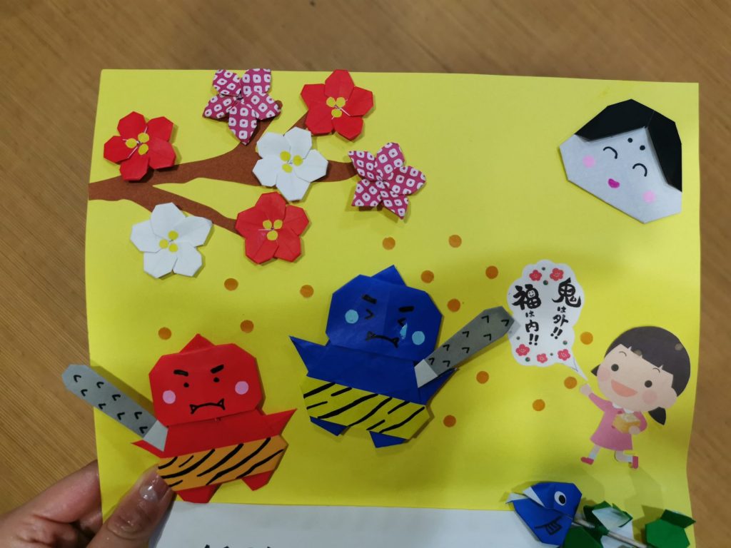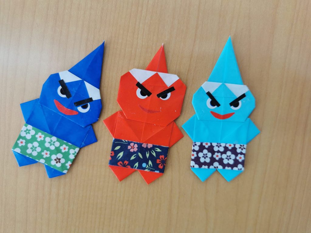 折り紙が趣味のS様が「赤鬼、青鬼を作ってみたの」と見せていただきました。