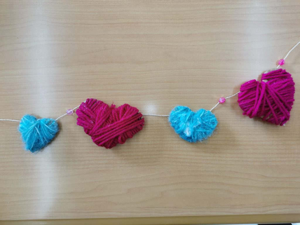という事で先日の日曜レクリエーションでは「ハートのモビール」を作りました。