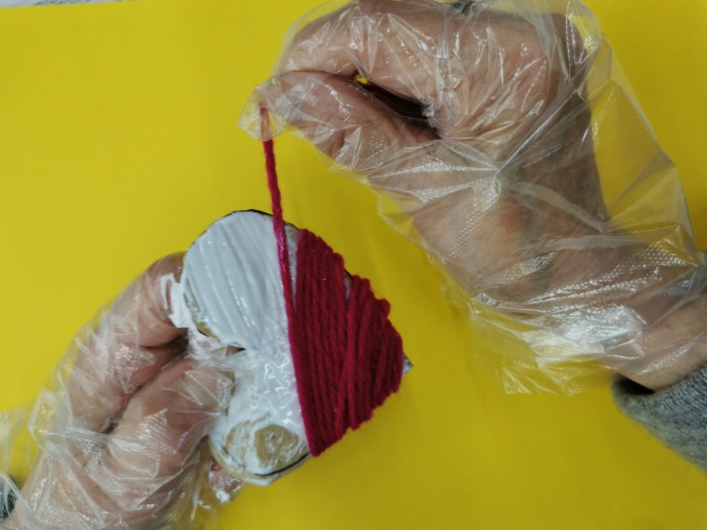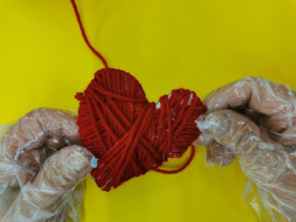 まずはハート型に切った段ボールに毛糸を巻き付けていきます。