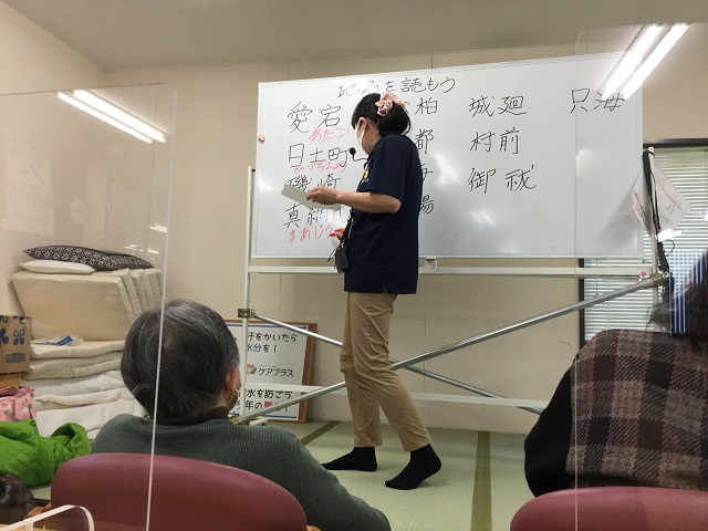 イベントでは、漢字パズルや地名漢字の読み方、実写版間違い探しなどを行いました。集中力や記憶力が必要な問題に一生懸命取り組んでいただきました。