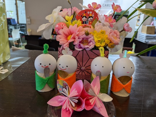もともとは中国から伝わった節句が起源。平安時代にワラや紙で作った人形を海や川に流して厄払いとする行事で、ある頃からその行事を3月3日に行うようになり、人形を飾るように変化したそうです。江戸時代ころには【ひなまつり】として定着したそうです。ケアプラス垣生にも可愛い手作りの おひなさま飾ってますよ!