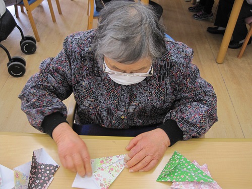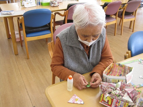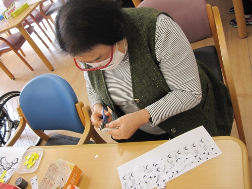 ここ宇和島ではお節句は旧暦で行っているため、桃の節句は4月3日に行っています。3月からお雛様の飾りを作るため、下準備からご利用者様と取り組んでします。今回は飾りのパーツが細かいため、手先のリハビリとして熱心に作業されていました。