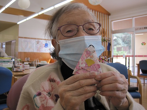 和柄の千代紙で色鮮やかな着物を作り、綺麗なお雛様が完成!皆さん、「この着物は可愛いね!」と言いながら、それぞれお好きなお雛様を手にされていました。