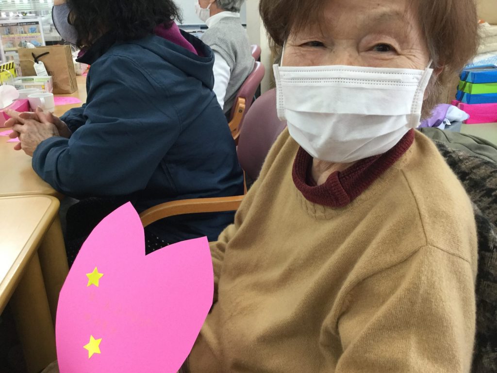 まず始めに、桜の形に切った画用紙に、今年の目標やお願い事を書いて頂きました。中には、孫に会いたいやもう一度車の運転がしたいなど個性豊かな桜の花びらが出来ました。始めは、なんて書こうかな。書くことない。など言われる方もおられましたが、書き出すと幾つも書く方もおられました。皆さん楽しそうに行っておられました。