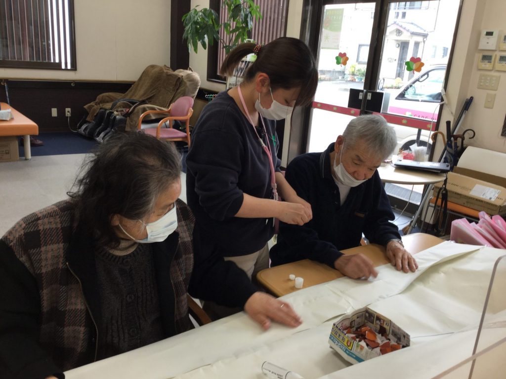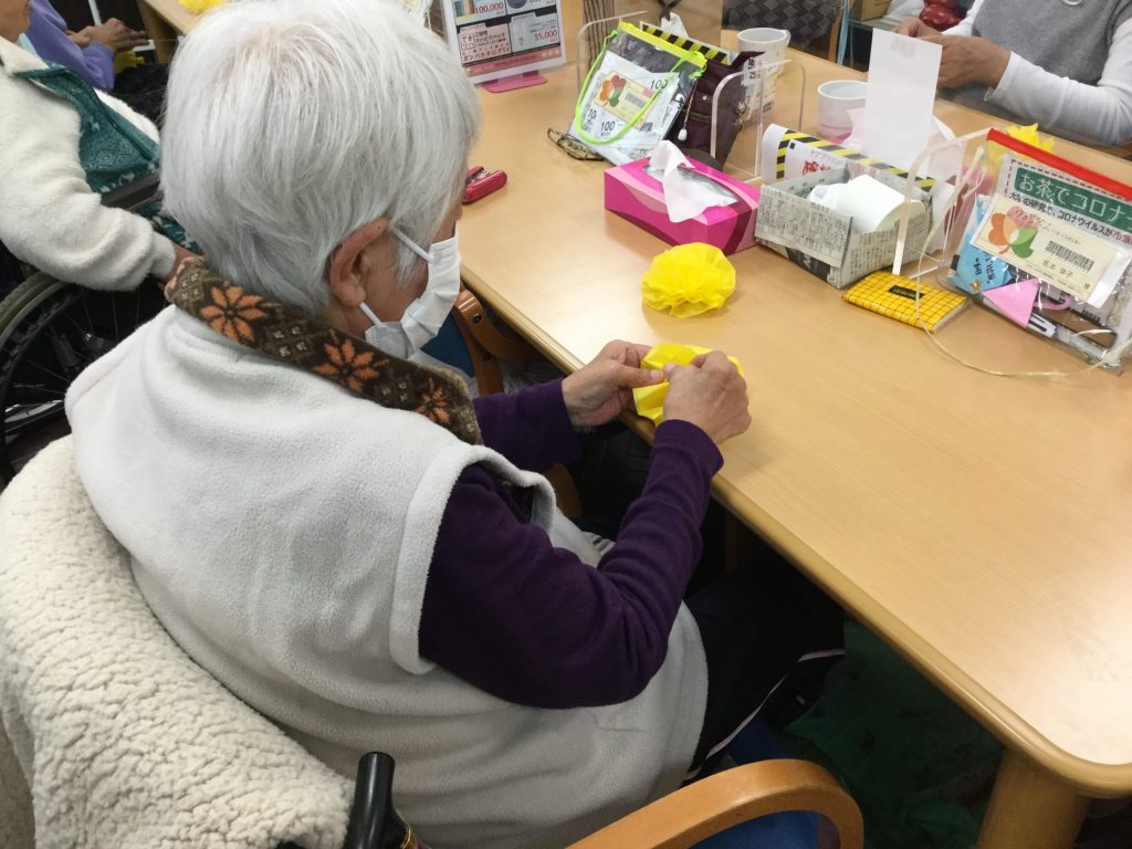 次は、桜の木の下に咲いている菜の花をイメージして黄色の紙花を作りました。女性の方には、紙花を折って頂き、男性の方には、紙花を開けて頂きました。中々上手に出来なくて困っておられる方もおられましたが、周りの利用者様がお手伝いをして上手にできていました。ご利用者様同士の交流も深めれたと思います。