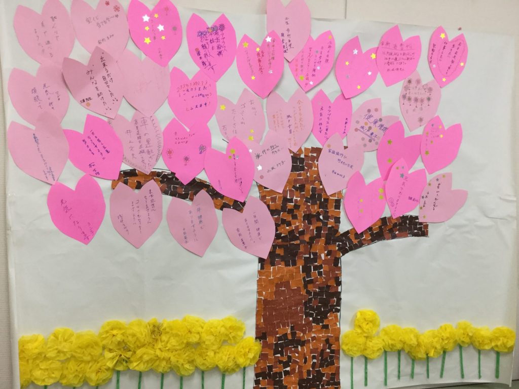 完成したのをみて「すごい、大きいね」と言っておられる方がいました。「私が書いたのがある」「こんなこと書いてるのね」など様々な声が聞こえました。また、「お花見に来ているみたい」と言われる方もおり、行ってよかったなと実感しました。
