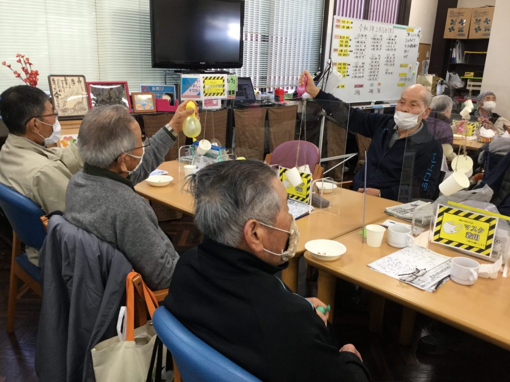 頭を働かせた後は体を動かします。リハスタッフによるマルチタスクの体操です。この時は、小さく膨らませた風船をできるだけたくさん握っています。力を入れ過ぎて風船を割ってしまうご利用者様もいらっしゃいますが、そのようなハプニングも全員で笑って楽しく取り組んでいます。