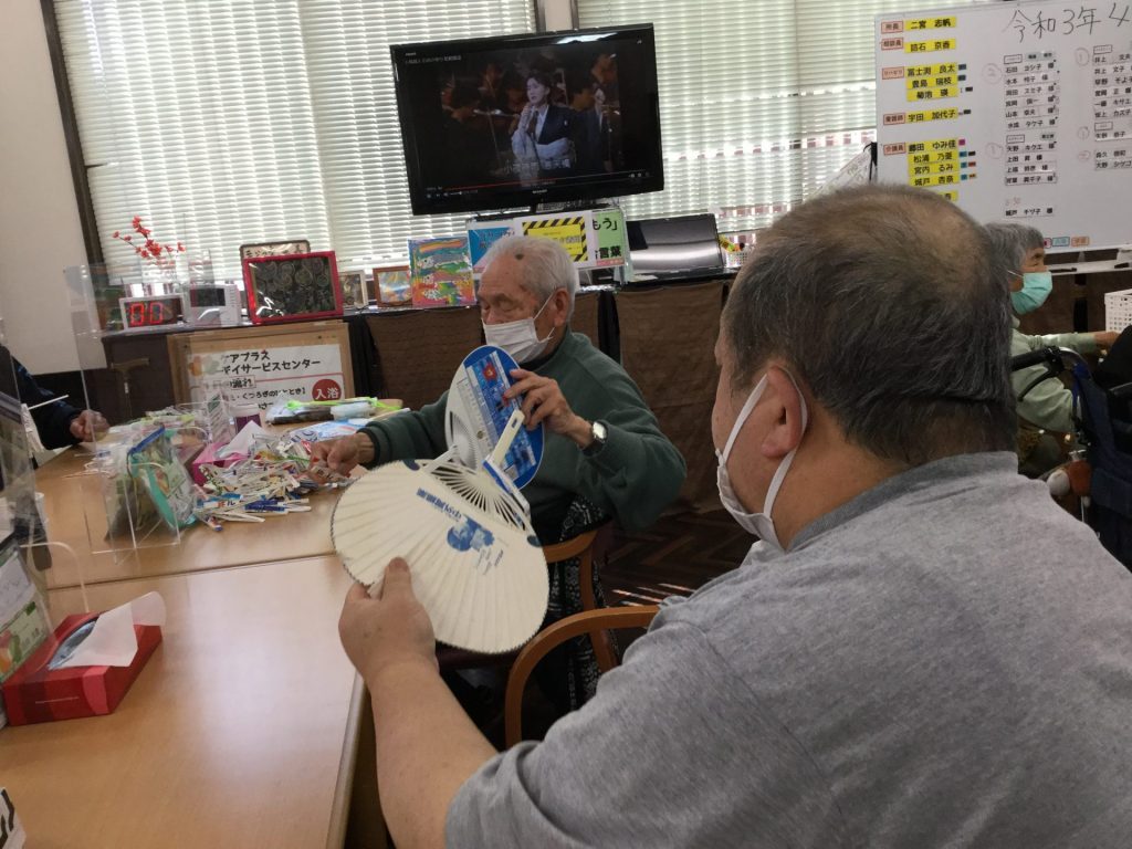 最後にスーパーガンバタイムを行います。今回はうちわの柄に切った牛乳パックを引っ掛けて隣の人に渡してリレーを行い、曲を流す間に幾つ運べるかを競います。皆様勝負ごとになるととても真剣な表情になり、「はよはよ」と頑張られます。