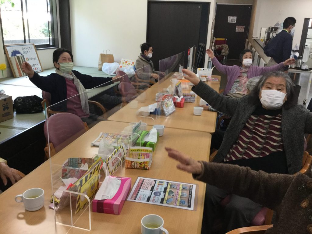 まず、ご利用者様が揃いましたら朝の挨拶を行います。お一人ずつお名前を呼ばせて頂くのですが、大洲のご利用者様は元気なお返事をして下さる方がたくさんいらっしゃる為、私の方が元気を頂くことが多くあります。挨拶が終わりましたら、お席でラジオ体操と脳体操を行います。まだまだ眠たい(それは私だけ?)体と頭をまず動かすことで、ケアプラスで1日元気に過ごして頂きます。