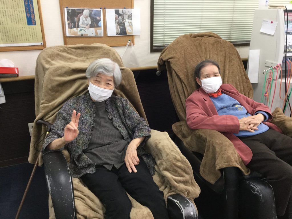 また、束の間のリラックスタイムで仲良しの方同士、マッサージチェアにてお喋りをしながら気持ちよさそうに過ごされる方もいらっしゃいます。カメラを向けると素敵な笑顔を見せて下さりました。