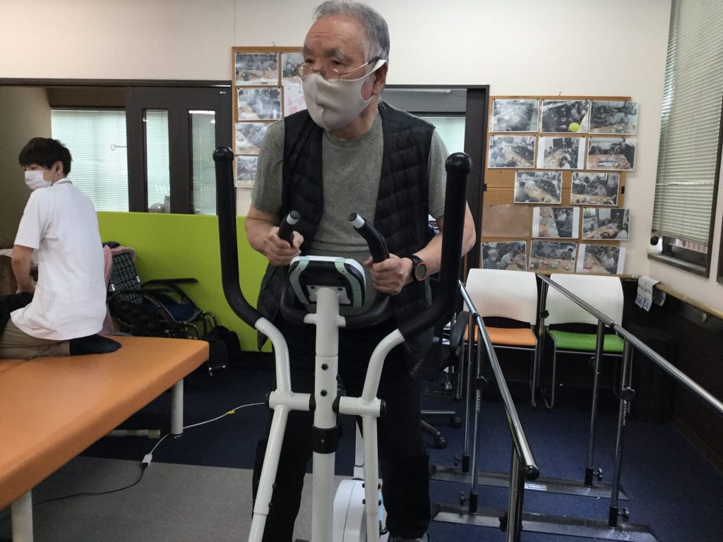 その後はお風呂に入ったり、リハに呼ばれた方は運動をされます。それまでの間の時間では塗り絵や脳トレの問題に取り組まれる方や、ご利用者様同士でお喋りを楽しまれるなどして過ごされます。スリングリハをされる方や、どこまでも行くぞと気合を入れてエアロバイクを漕がれる方がいらっしゃいます。