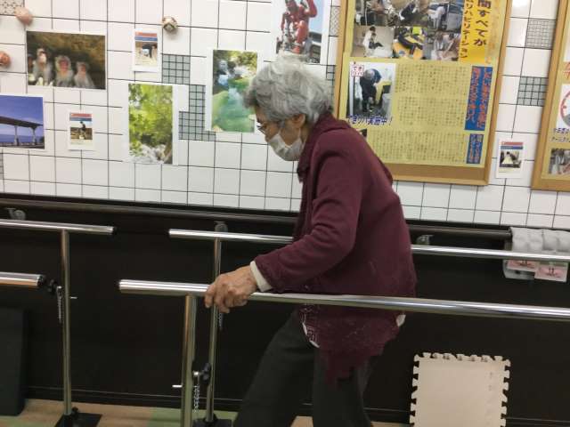 さらにスリング・平行棒内歩行時に体幹筋やバランスを鍛えることで骨盤の歪みや前傾姿勢を改善することにしました。