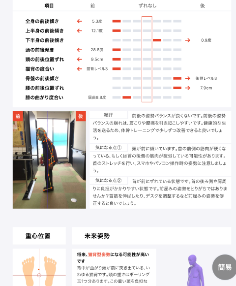 横から見た姿勢は前傾姿勢で猫背になっている為、重心の位置は前方で骨盤や下半身の位置は後方にあります。