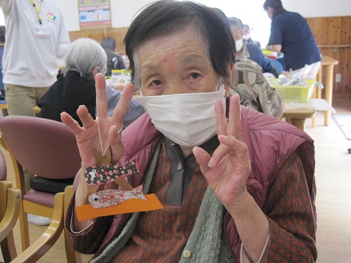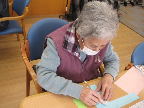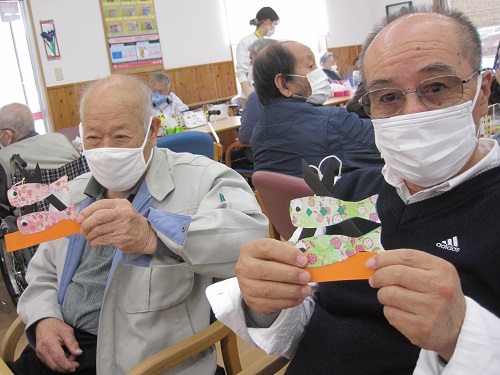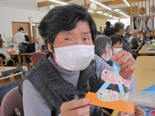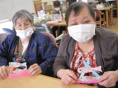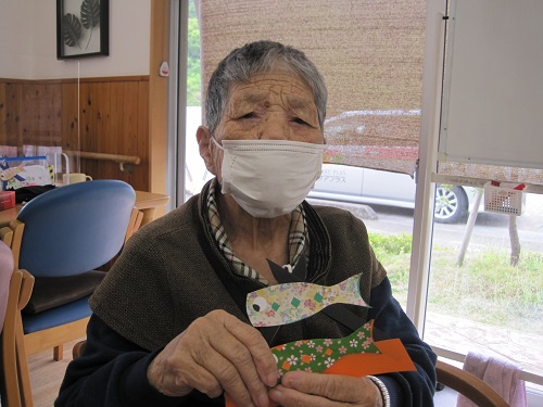たくさんの工程の中で、鯉のぼりの型に和柄の折り紙を重ねるのが、一番難しかったと皆さんが口をそろえて言われていましたが、出来栄えを見ると端をきれいに揃って貼られていました。皆さんの集中力と手先の器用さには驚きを隠せません。