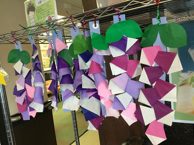 創作レクは毎回、違った物を作って頂いておりますが、この日は見頃を迎えている藤の花を作りました。