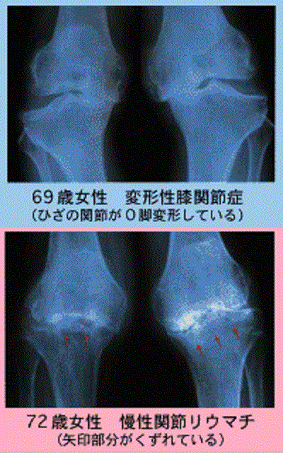 ちなみに、中高年以上に最も多い腫れと痛みは「変形性関節症」(写真上)で、関節の軟骨がすり減ったものです。また、「慢性関節リウマチ」(写真下)は膠原病の一種で、朝のこわばり、左右対称の腫れと痛みなどが特徴です。