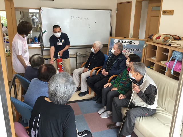 火事の際に消火器を使用されることがあるかもしれません。使い方や注意点を皆様の前で実演を交えて説明しております。