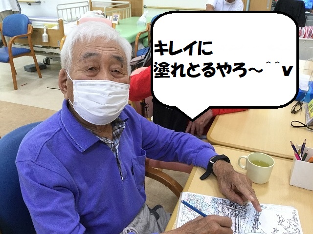 塗り絵を色鮮やかに仕上げているこのご利用者様。色合いもご自身で考え濃淡も指先の力加減でつけておられます。