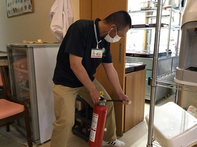 「火事だー!」厨房の方から声が聞こえ、介護員東出が消火器を抱えて初期消火に向かいます!しかし!消火失敗…