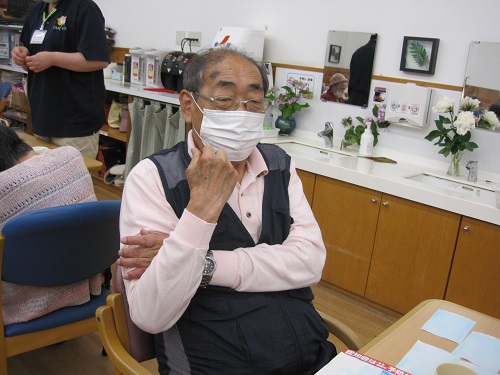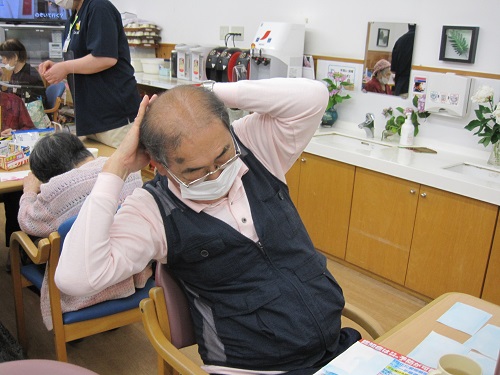 今日は、ご利用者様と一緒に「高血圧を予防するストレッチ&足うら刺激」を実践してみます。皆さまも一緒にやってみて下さいね。入浴時は、筋肉が温まって伸びやすいのでストレッチに最適です。