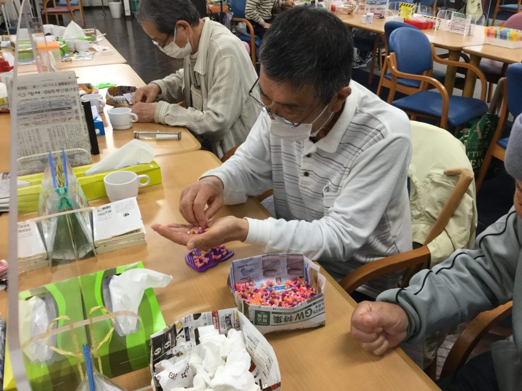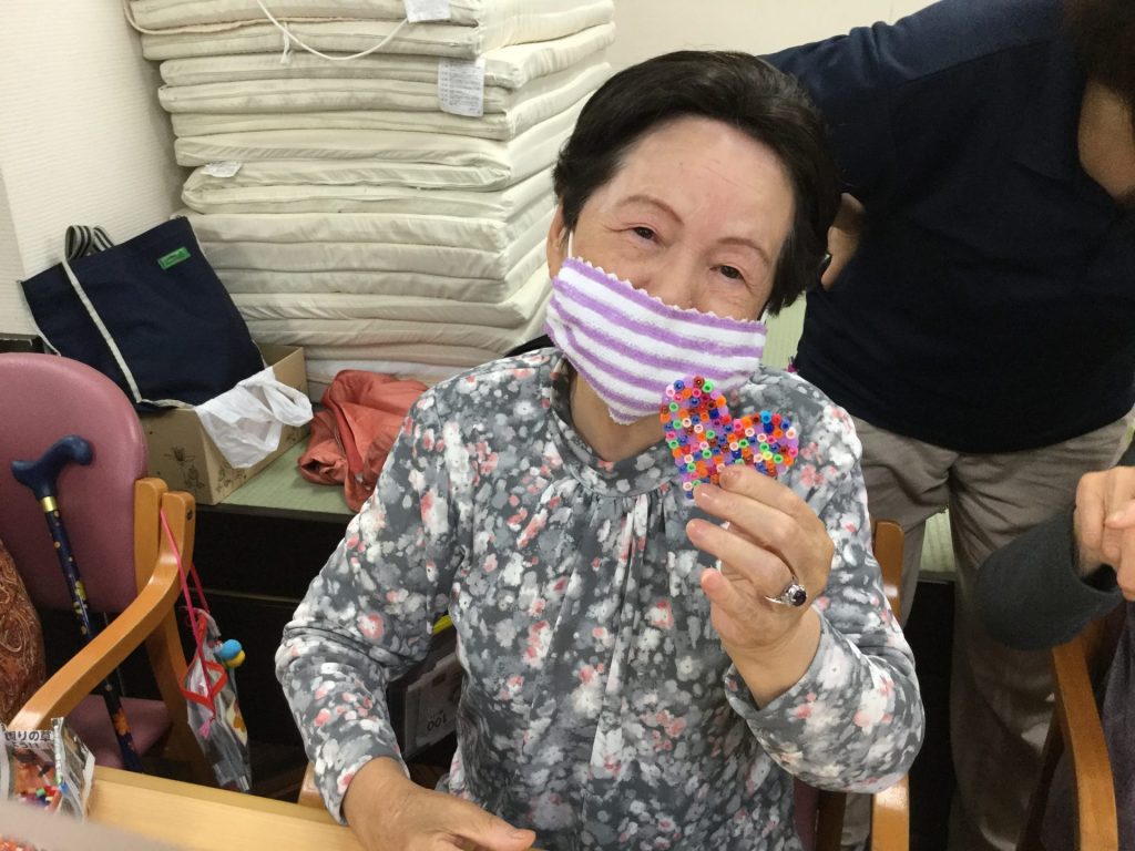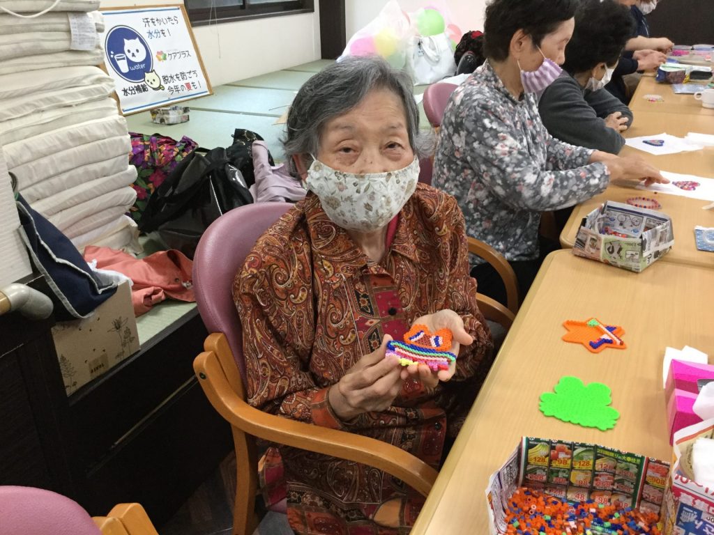 星やハート、丸やイルカなどの形をした無数のピンのついたボードに、3㎜程のビーズを挿していくレクリエーションです。最初はどうしていいかわからないご利用者様もいらっしゃいましたが、職員と一緒に一つ一つピンにビーズを挿して形ができてくると「可愛いね、ここは、この色がいいね」と積極的に参加して頂きました。器用な方は色を綺麗に分けられ、話をするのも忘れて一生懸命コースターを作られていました。出来上がると「可愛いのができたね。持って帰って湯呑の下に敷こう」「私は一輪差しの下に敷こうかね」と使い道を考えておられました。