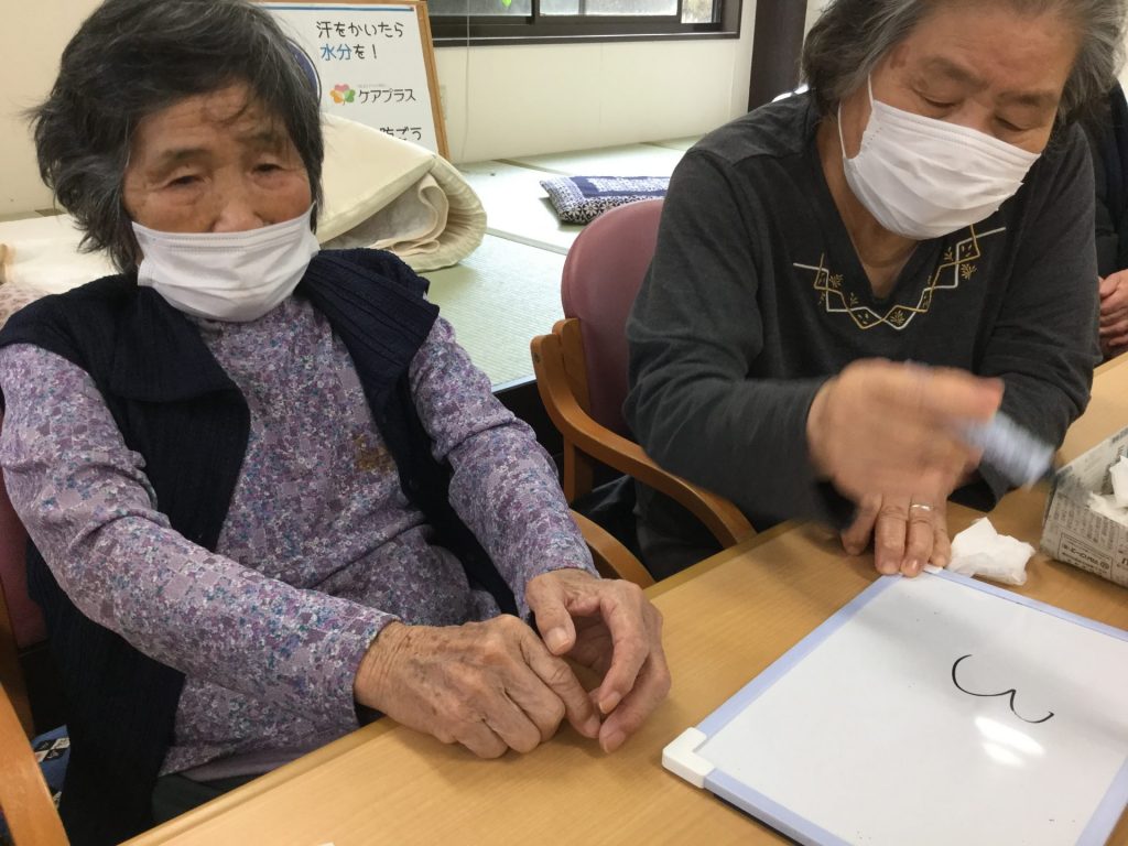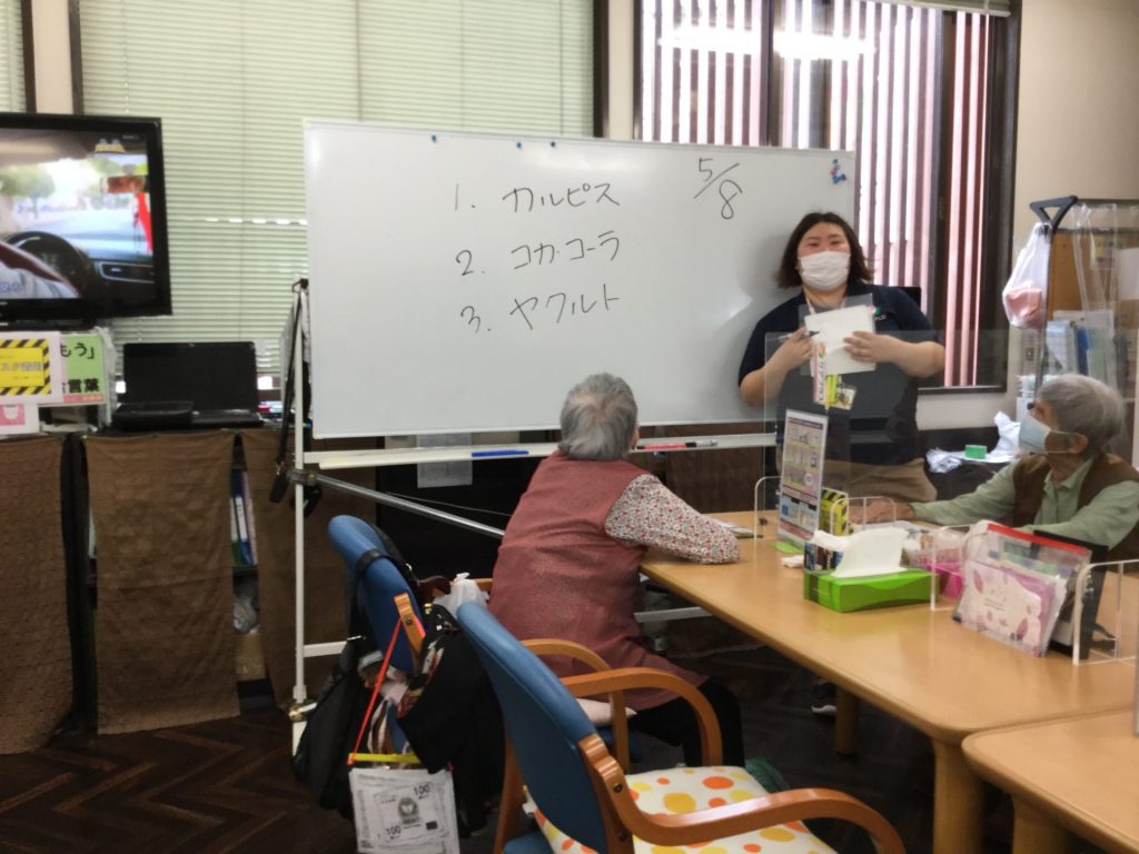 まず初めにクイズ大会の様子です。今回のクイズは五月に関する問題を用意しました。問題は三択問題で、各テーブルごとにホワイトボードとマジックを用意し、これだと思う番号をホワイトボードに記入して頂くという方法で進めていきました。問題が出題されると、隣席の人と「これ何番?」「あー、分からん。もう勘やね」とお話されながらホワイトボードに記入されていました。正解するとケアプラスのネームの入ったプレートを仕切りのボードに吊るしていきました。「○○枚あるから○○個正解やね」と皆様、嬉しそうに話されていました。