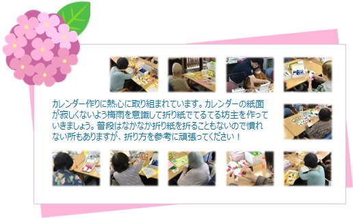 カレンダー作りに熱心に取り組まれています。カレンダーの紙面が寂しくないよう梅雨を意識して折り紙でてるてる坊主を作っていきましょう。普段はなかなか折り紙を折ることもないので慣れない所もありますが、折り方を参考に頑張ってください!
