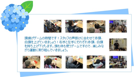 旗揚げゲームの時間です!スタッフの声掛けに合わせて赤旗、白旗を上げていきましょう!右手と左手にそれぞれ赤旗、白旗を持ち上げ下げします。頭も体も使うゲームですので、楽しみながら運動に取り組んでいきましょう。