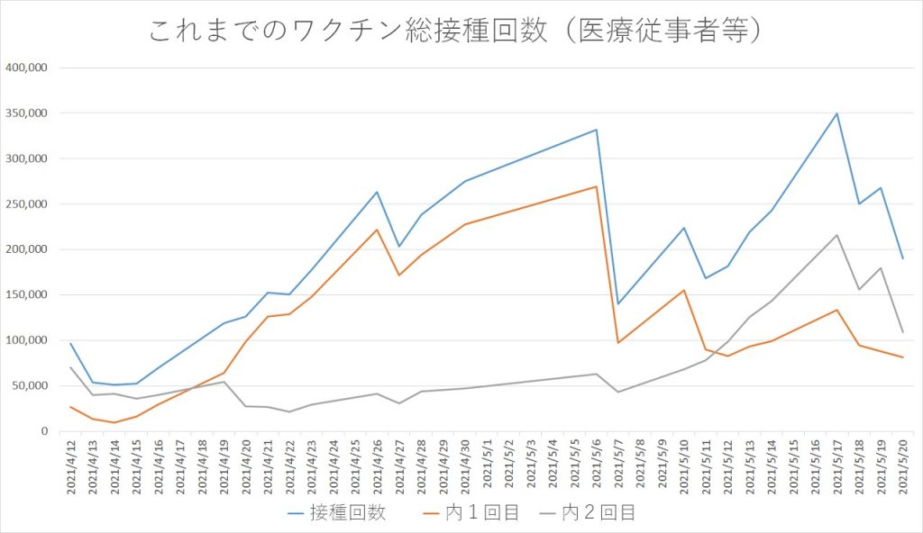 日別のワクチン接種回数をグラフにすると以下の通りとなります。