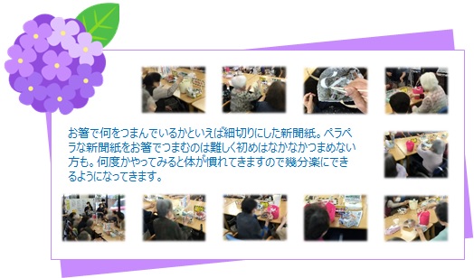 お箸で何をつまんでいるかといえば細切りにした新聞紙。ペラペラな新聞紙をお箸でつまむのは難しく初めはなかなかつまめない方も。何度かやってみると体が慣れてきますので幾分楽にできるようになってきます。