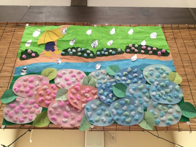 まずは貼り絵。6月のホールを飾る貼り絵は、雨とアジサイ!