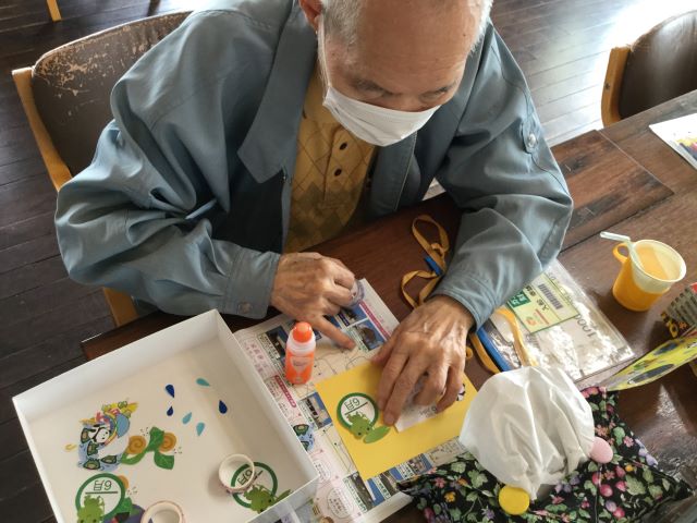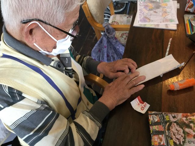 チラシとハサミと糊だけで出来るのですが、持ち手のバランスを整えたり、底をしっかりくっつけるのに、なかなか手間取られていました。それでも1つ作るともう1つ!と頑張る方もいらっしゃいました。