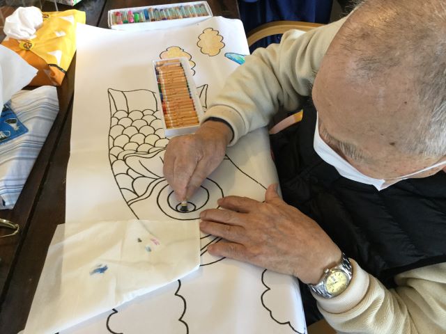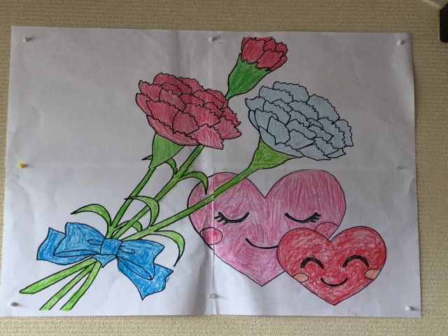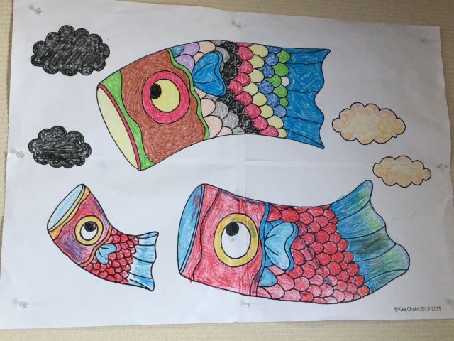 合作塗り絵は鯉のぼりや母の日のカーネーションが鮮やかにアレンジされて塗りあげられました。